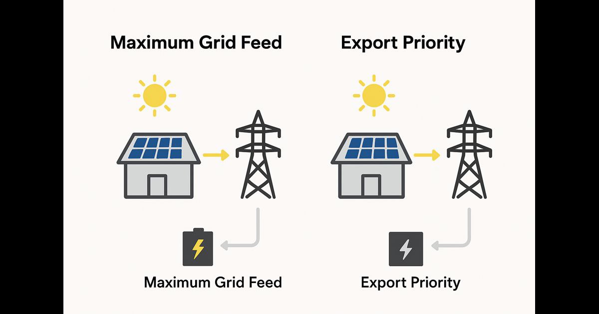 • With Export Priority ON: the system sends surplus power to the grid first, before charging the battery.